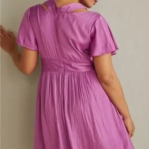 Anthropologie Vibrant Deep-V Mini Dress in NWT condition. Vibrant pink purple tone, flowy skirt, plunging neckline, flutter sleeves, back zipper. Soft smooth fabric, lined. Measurements are: 26 inches from armpit to armpit, 23 inches under bust, and 38 inches from shoulder seam to hem. Size 24, please use measurements for best fit.