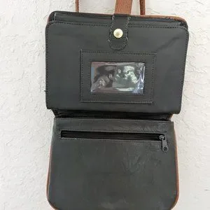 Beautiful forest green leather purse with multiple pockets and places to put things, including card holder, zippered pockets and flaps with snaps. Measures 6.5"x7.5"