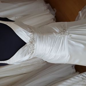 Stunning! This silky satin is heavenly soft. Beautiful drop waist Maggie Sottero wedding gown with corset back. NWOT store sample tried on in boutique setting. Has a few minor dust marks under train & a few loose strings. Snatches the waist & hips just right. size 10 bust 37" waist 28.5" hips 40" ivory color.