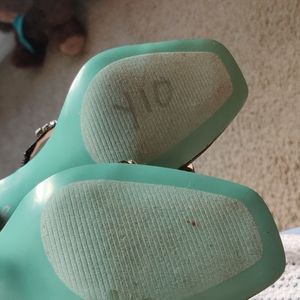 Dare to bare Rhinestones on all three straps blue sole satin fabric.Small tear in right shoe on the heel bed inside please see photo around the logo from tag removal
