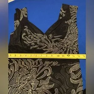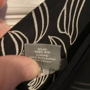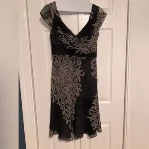 This is a gauzy, lightweight, gorgeous silk dress in layers of white abstract flowers on navy. The bust is an extremely flattering wrap front, with hidden bra strap snaps at the collarbone (rather than shoulder). Length is 41" shoulder to hem and the rib cage snugly reaches 14" across. There's a hidden side zipper as well.