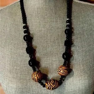 Black and silver bead necklace with accent beads of brown & tan tiger stripes