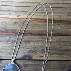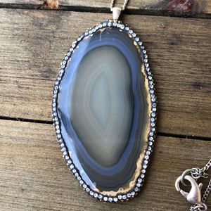 9- Polished Natural Geode Slice Pendant in Neutral Tones Crystal Surround! This is stunning!! This photographed with a lot of blue outside. At night inside this is definitely browns and neutrals. What does that mean? The coloring of this fabulous stone will change with the lighting. Just like any natural stone, it will pick up tones from the lighting. Absolutely fabulous and love the crystal surround. BNWOT perfect for a gift or treat yourself. Please review the pics as they are part of the description. Reasonable offers welcome