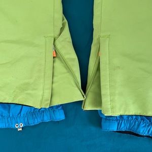 Expandable waistband, expandable zippered cuff and zippered vents with ultra soft fleece lining and abrasion resistant outer shell.