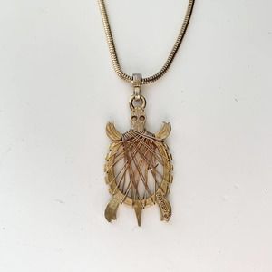 Vintage Napier gold-tone wire wrapped sea turtle pendant on chain necklace.