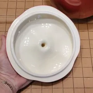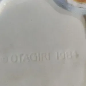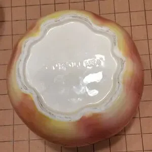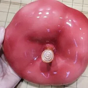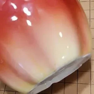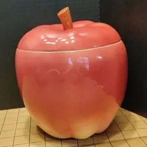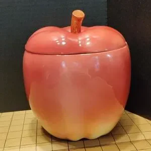 Vintage Otagiri 1984 apple shaped cookie jar. Glazed ceramic in red, yellow, brown. Very good condition; glaze has good color & shine; see photo of very small chip that has been well repaired (I almost overlooked it).