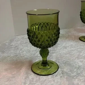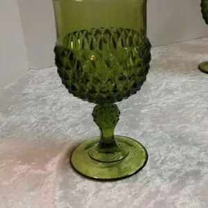 Vintage Glass Diamond Point Green Water Goblet, Mid Century Glass