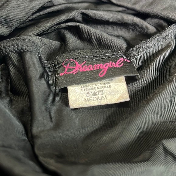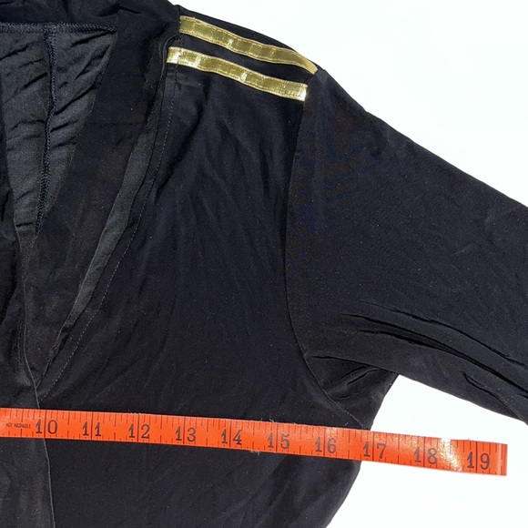 Dreamgirl Halloween Costume/Cosplay Mile High Club Flight Attendant Body-con Mini Dress. Shortsleeved a-line mini dress. Gold stripe detail on shoulders and sleeves. Stretchy sheer material. Neckline tie v-neck detail. Size: Medium. Material: 92% Polyester & 6% Spandex.