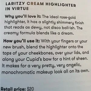 ⭐️HOST PICK!⭐️ NWT Laritzy cream hilighter in “Virtue.” The ideal rose-gold highlighter. It has a shimmery dewy finish. Blends like a dream. Use with brush or fingers. Blend into the top of your cheekbones, over eye lids, etc. .07 oz