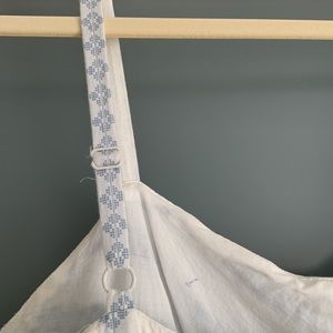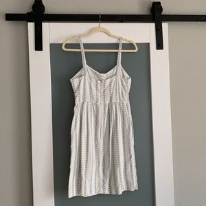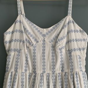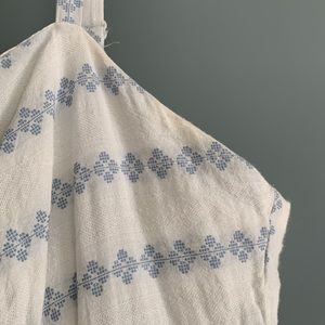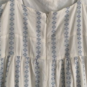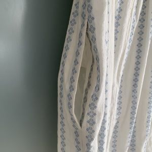 J. Crew white 100% cotton dress with blue vintage-style print. V-neckline and adjustable straps. Hits me at mid-thigh (I’m 5’8”). Fully lined. Has functional pockets. Zip back.