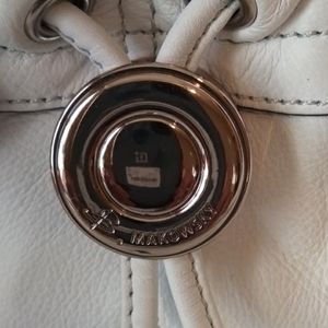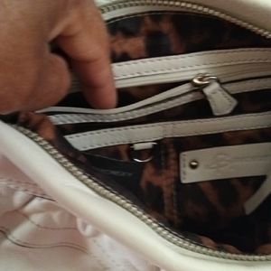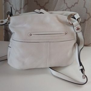 Gently used white cross body bag with adjustable strap. 2 slip pockets in front and 1 at the back. Interior of bag has 1 large zipper pocket and 2 slip pockets. Silver hardware. H about 9". R-L about 10". Soft supple 100% leather.
