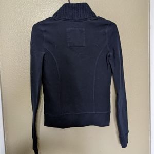 Navy blue button up jacket. High neck, wooly-ish collar. No pockets but super cute! Juniors XS.