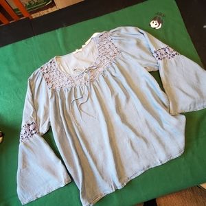 Adorable denim top with long bell sleeves. Crocheted inset at sleeves and front neckline. Tie front. Flared bottom.
