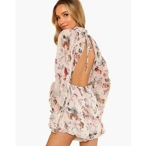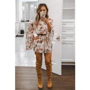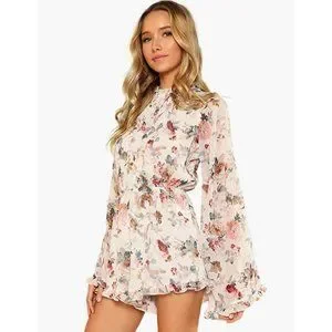 Look like you were handpicked from heaven with this gorgeous printed romper dress! Featuring a luscious, multicolor floral printed chiffon and flirty, oversized bell sleeves. High neck construction and open back with ruffled details throughout. Lightweight, flared long sleeves that are suitable for the transition of the seasons. Pull on closure. Make them melt into euphoric bliss with this ultra flirty ruffled romper dress. ❤️