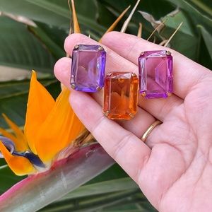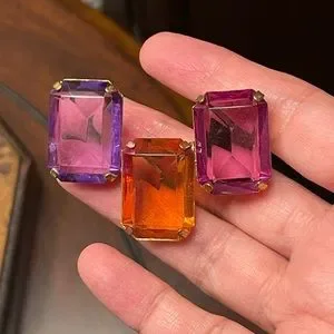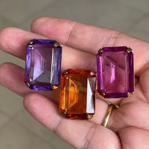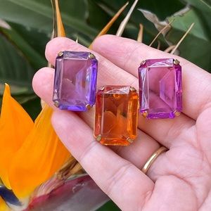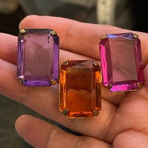 This an absolutely gorgeous and very usual three color emerald cut rectangular lucite stones & gold tone pin brooch. The color combination is just wonderful. There is no stamp on the back, but the style is from the 1960s. In excellent vintage condition.