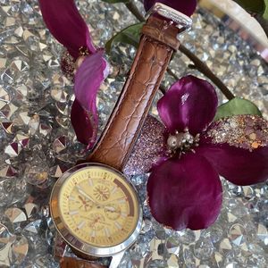 Preowned, in great working condition, buttery new, Swiss parts, sapphire crystal , 100 m water resistant, leather belt shows worn signs