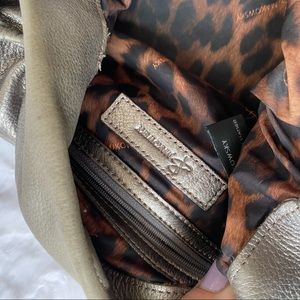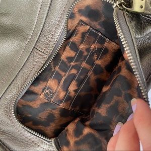 Beautiful B. Makowsky silver leather shoulder bag, in pretty good used condition, with slight wear on the outside. Magnetic closure, leopard interior.