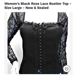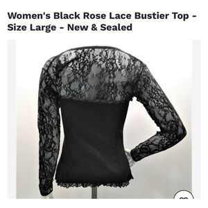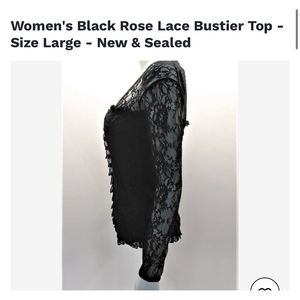 NWT Black Large Bustier Blouse has boning and lined.. lots of stretch.. 90% polyester 10%Spandex front has 20 hooks. Well made style #7383 so classy I kept one for me! Pit to pit 17” back neck to hem 24.5” perfect w jeans or sexy nite out runs small