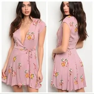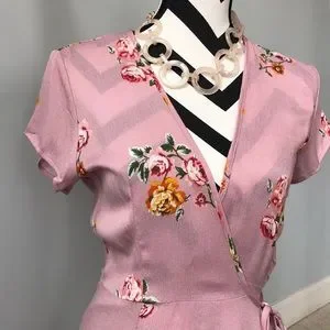 Mauve Floral Wrap Dress. Gorgeous for that Spring/Summer event. Capped sleeves. Wrap styling with tie waist. 100% Measurements laying flat: