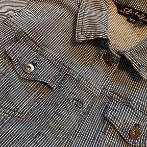 CHARLIE B soft denim jacket, blue and white vertical stripe. Matte dark silver buttons. Worn once, excellent condition.