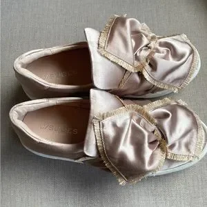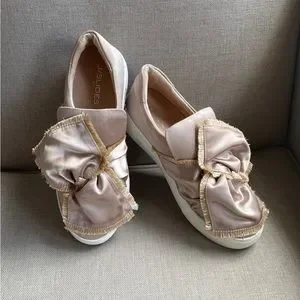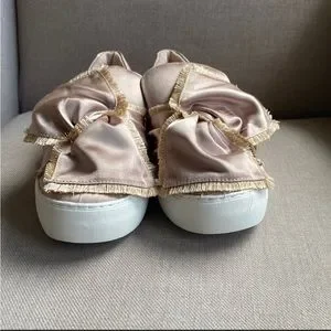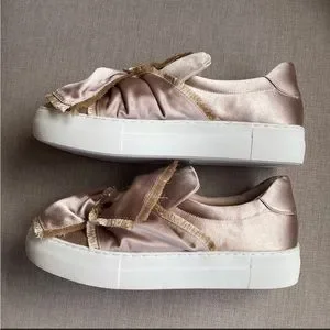J/SLIDES NYL NWOT GOLD SATIN BOW PLATFORM SNEAKERS Sz 7.5