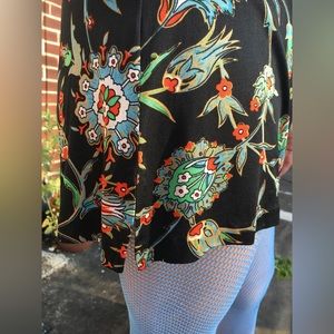 Nieves Lavi New York really chic long sleeve SILK mini dress. Two covered button closure at the back of neck and awesome buttons at sleeve cuff. Has a bit of a puff shoulder sleeve. Fabulous super 60’s paisley print fabric. Slight bell sleeve. Slits on sides. SHORT. This dress brings really good vibes with it. Whew!! Good condition. Armpit to armpit: 18” Sleeve: 23.