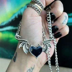 Black enamel heart with bat wings and devil horns on silver stainless steel chain . Cuban chain style Choker is Adjustable from 14 to 16 inch and 7mm thick ( if you need a different lenght just lmk before purchase , i could adjust ) Handmade by me π Antique silver plated heart charm . TAGS : Goth / gothic / celt / celtic / boho / bohemian / st Valentine , be mine , xmas , date night , angel wings , bats , vampire , devil horns , love , i love you , forever love , cupid , rock , rock & roll , rocker , fairy , witch , mermaid , punk , steam punk , fetish , viking / biker / gift / Stylish / trendy , hand crafted / spikes / rockabilly / pin up / fun chokers / casual / clubbing / music festival / medieval fair / Any questions lmk / I ship fast !
