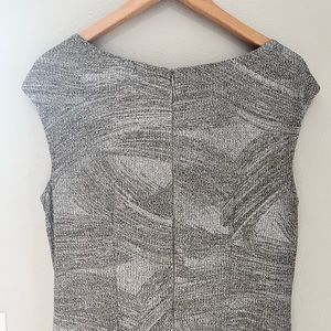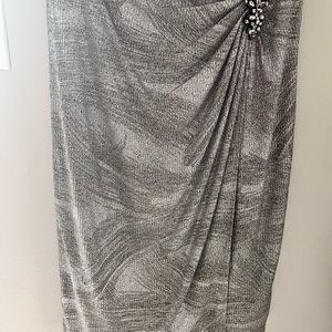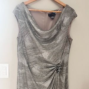 Size 14 Silver zip up dress. Gathers at the hip with a jewel embellishment. Cowls neck scoop and silver shine give it a nice look for any party or Holiday.