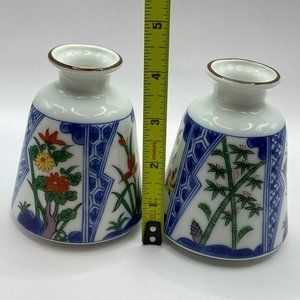 2 Floral Porcelain Japanese Flower Bud Vases Blue White Gold Toned Rim Small 4"