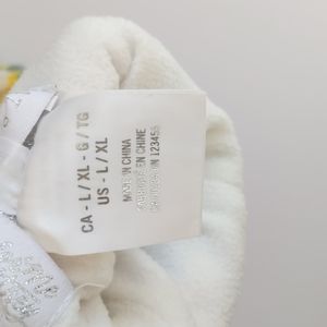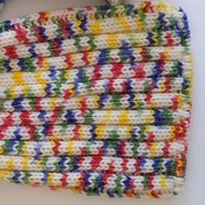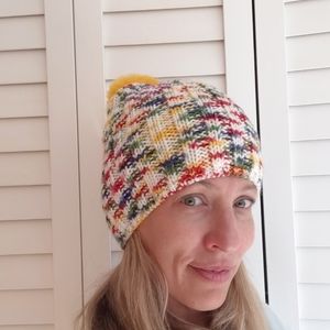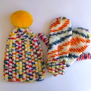 HBC Stripes x Color Me Courtney space dyed knit hat (toque) and mitts. Hat has a gorgeous fluffy yellow pompom. It is "one size". Made of 98% acrylic/2%other fibres. Mitts are size L/XL. Fleece lined. Very cozy! They are in excellent condition. Have been freshly washed and ready for winter wear!