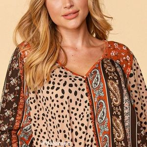 ❤️NEW! V Neck Soft Knit Boho Leopard/Floral Color Block Top with Bubble Sleeves!