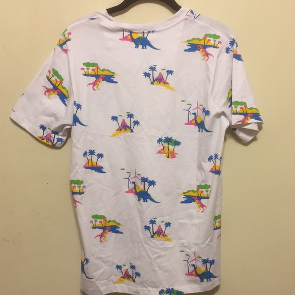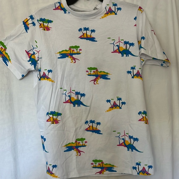 NWT Free Planet Tropical dinosaur print tee shirt, size small, 95% cotton, 5% spandex. Pit to pit 20”, length 26”.