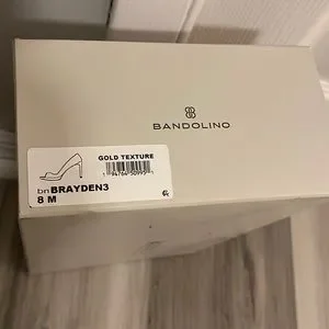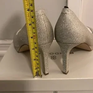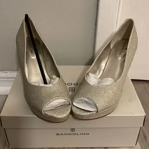 slip-on design, peep toe, and wrapped platform and heel. Box says “Gold texture” but looks silver. Never worn