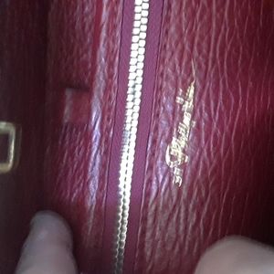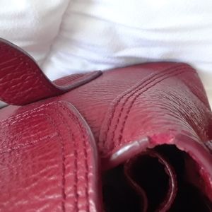 BAG IN EXCELLENT USED CONDITION...TINY LITTLE SCRAPE ON EDGE OF BACK...SEE LAST PIC...INSIDE MILD SOILING ON BOTTOM...COLOR IS A VERY DEEP RED..TEXTURED LEATHER..GOLD HARDWARE..SIZE IS APPROX 8.5X7...DEPTH 3..BAG IS BEAUTIFUL!!! PRICE IS FIRM