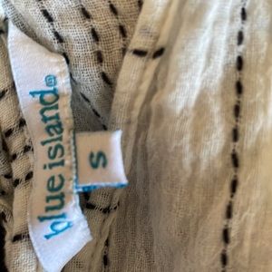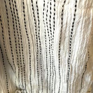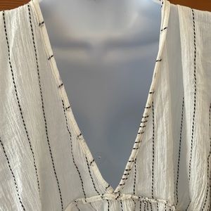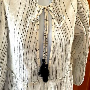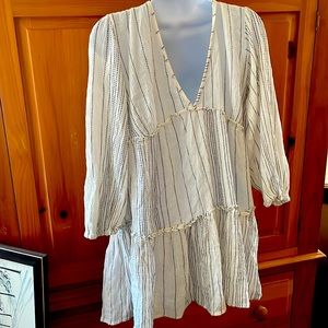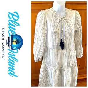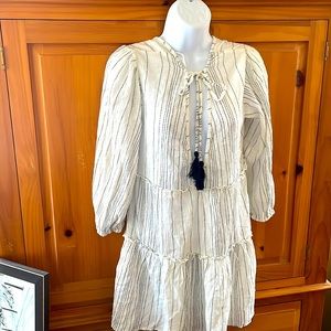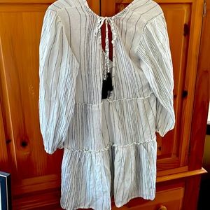 In excellent condition, brand new without tags. No stains, tears, rips, holes, shrinkage, pilling, or flaws of any sort. 98% Rayon & 2% Metallic. It has a relaxed fit. It is a light weight material. It has long sleeves. It is great for the spring, the beach, fall, and vacations. It is perfect for casual wear. The dress is white. It is flowing. It has small, thin black dash, vertical stripes. It has a bow and the string has the same pattern as the fabric on the dress. The tassels are black. I would recommend wearing a tank top underneath the dress because it shows off some skin underneath the bow. See photos & video. There is also a V in the back. This dress can be paired with leggings for a nice look. Bundles of any 2 or more items are 20% off in my closet. Mix or match the categories. Comment with any questions. I am open to offers.