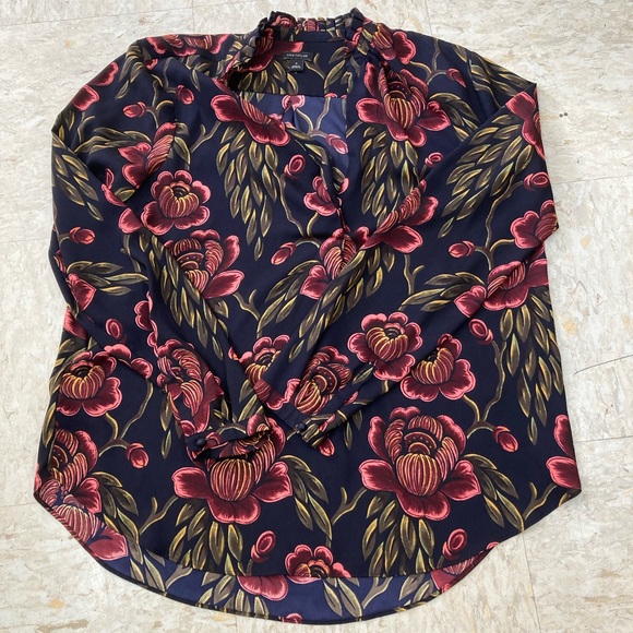 Ann Taylor blue shirt w/ flowers, slight ruffled collar, v neck. Size M