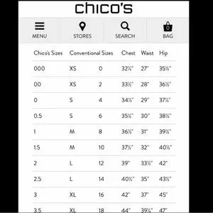 Measurements in photos. Chico’s size 1.5=Ladies size Medium or 10.