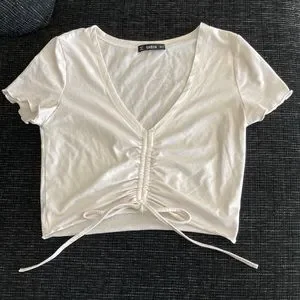 Tie front adjusts the ruching in the front to change how cropped the shirt is