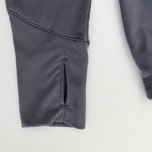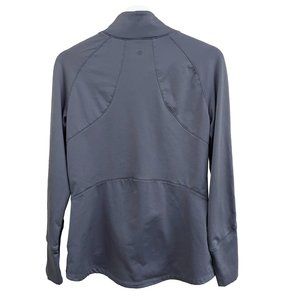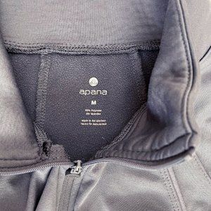 This Apana Yoga (or track) Jacket in a cool steely gray color is your best friend on your next run or after your next yoga practice. It is a light weight jacket, and the fabric is soft and stretchy. The inner tag is cut out so I'm not sure the material blend. It has front pockets and thumb holes for a cozy fit. In good used condition, no visible flaws or stains. See photos for measurements.