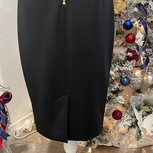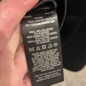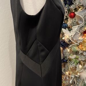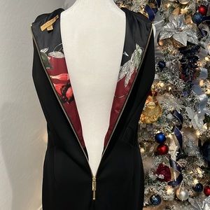 Ted Baker, black satin dress with classic gold tone back zipper. This little black dress is sleeveless and has a V neckline. It has a straight line skirt and falls just below the knee.The dress has a deep V shaped corded ribbon design at the waist line on each side in the same black color . Fully lined with the classic Ted Backer floral design on the upper lining. Gently woren one time with absolutely no tares,stains or marks in excellent condition. There is a matching black tuxedo style jacket being sold separately but I can bundle the 2 pieces at the time of sale.