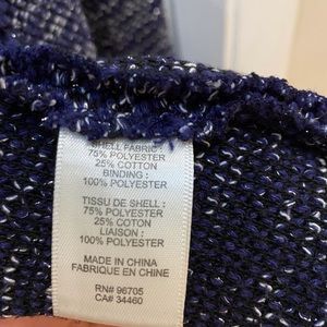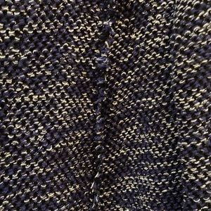 Rebecca Taylor navy cardigan blazer, size 2.Relaxed fit open blazer/cardigan. Tweed navy/creme with some slight silver. Seams are fringed throughout for a more edgy look. Two front zip pockets and zippers on the sleeves. Small pads in shoulders, dry clean only. No closure, open style. Previously loved, great condition.