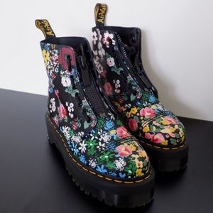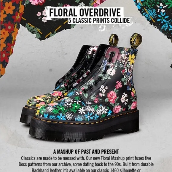 Floral overdrive. This 90s-inspired rework fuses five different Floral prints from our archive: Wanderlust, Wild Floral, Victorian Flowers, Pansy Fayre and Ditsy Floral. A mashup of past and present, the boots are set on a stacked platform sole and fitted with a removable jungle zip piece.