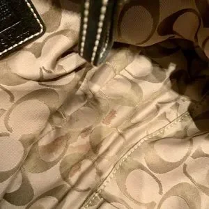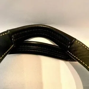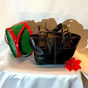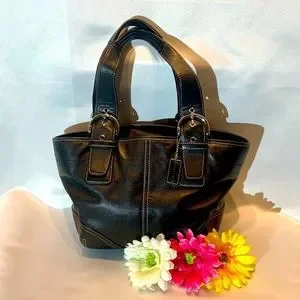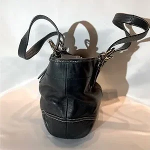 Beautiful black calfskin satchel, Vintage Coach Soho bag #9544. Adjustable shoulder straps from 9 1/2” to 14” at top. Nickel hardware, detachable zipper closure at top. Pinprick sized white dots in a couple places. Reinforced handle at top of shoulder straps. Gold satin Coach logo lining. There are a few smudge/stains on lining at bottom of purse. See photos for full condition. This bag is the perfect size for every day use.
