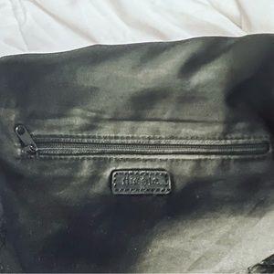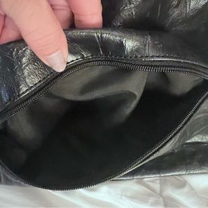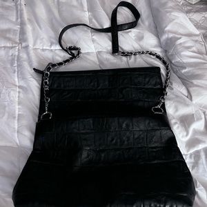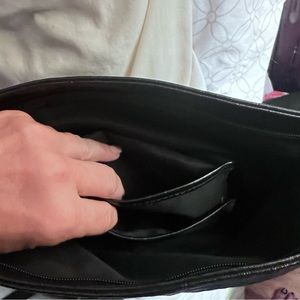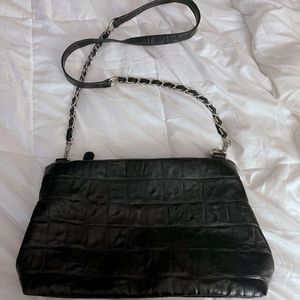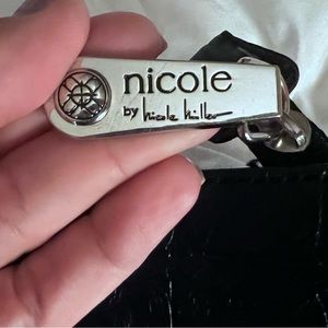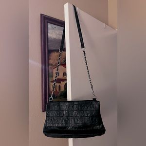 Nicole by Nicole Miller gorgeous black leather fold over crossbody/shoulder bag with with leather and silver tone chain/handle. I’m front top zipper pocket huge amount of room. Also in back on top zipper pocket with more room. Once purse is lied out, you have a huge deep area to fit all of your belongings, zipper pocket inside with three pockets on opposite side. Very soft very stylish. Worn a few times excellent condition.
