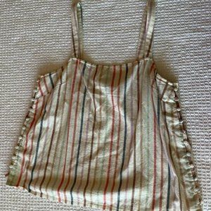 MADEWELL - SMALL - COLORFUL STRIPE BLOUSE - Perfect for any maximalist out there! Light, fresh blouse perfect for picnics or grocery shopping. This linen blouse is so comfortable, as most Madewell items are. The bright yet muted colors of the stripes really allow anyone wearing the blouse to wear it as is or by layering it with a variety of tops. The sleeves are an inch wide, and there is a side zipper to help get yourself tucked in!