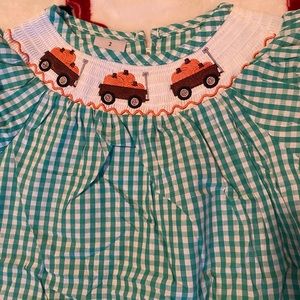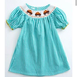 Teal gingham dress with smocking of pumpkins in wagon. Very cute and perfect for fall/autumn and thanksgiving