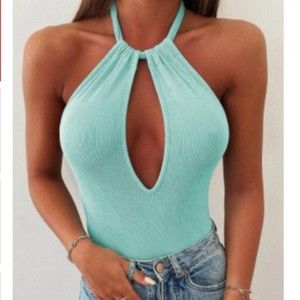 Sky Blue Keyhole Halter Ribbed Bodysuit