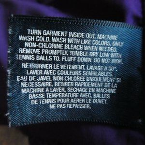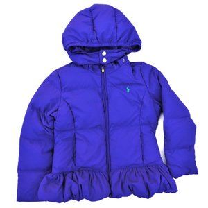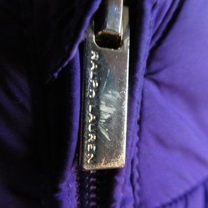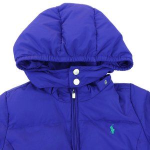 Ralph Lauren Blue Label Purple Puffy Coat Peplum Detachable Snap Hood Green Pony. 60% Down plus Fowl Feathers Fill. Logo Spell Out Zipper Pulls. Machine Wash. Tagged Size L 12/14. Measures XS Womens or Girls Large. Selling as a petite Women's XS...see measurements to ensure fit.