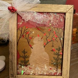 This little guy is so cute. Snowman with some cardinals and snow falling. Great for mantle, counter on tiered tray, add to a dough bowl. So many ways to use this adorable picture. No tags but newly made by me.