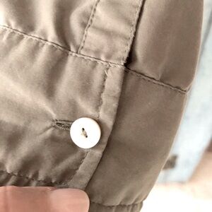 This shirt feels like silk and looks like silk but is polyester and washable. Beautiful khaki/olive color (photos don’t do it justice!) with patch pockets on front and epaulettes with buttons on shoulders. It is long-sleeved but sleeves roll up with button flaps to hold them in place. Shirt-tail hem. Can be dressed up or down and worn with jeans for a more casual look. Measurements are: Pit-to-Pit = 24”; Back Length = 30-1/2.” Chico’s size 3 which equals a size 12/14. Love this shirt but it doesn’t fit anymore!